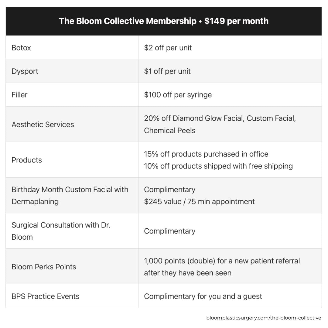 💡 Tip: Membership makes an incredible gift. Whether you’re a regular Botox patient or just beginning your journey with aesthetics, this is the most valuable way to experience Bloom Plastic Surgery all year long. Bloom Collective Member pricing applies to treatment with Dr. Bloom and Sydnei!